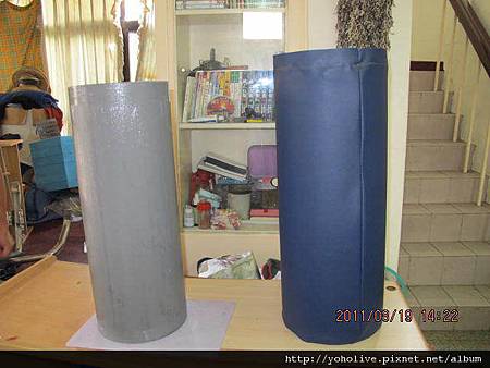 我們原本想自己包最外層的塑膠套,後來發現難度太高,恐怕不是膠帶、釘槍可以完成,只好請外面帆布廠商的師傅幫忙車,順便裝上拉鍊,這樣以後還可以拆下來清洗。大家都説包好後的滾筒很像拳擊沙包,確實是蠻像的!
