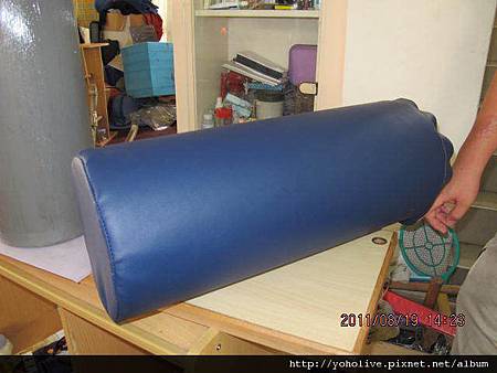 包完軟墊後,最外層再套上以塑膠沙發皮車縫而成的套子。下圖左邊的滾筒剛上完膠,等膠乾了以後才能包軟墊及套上塑膠皮套,右邊的滾筒是完成品。