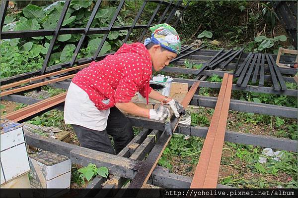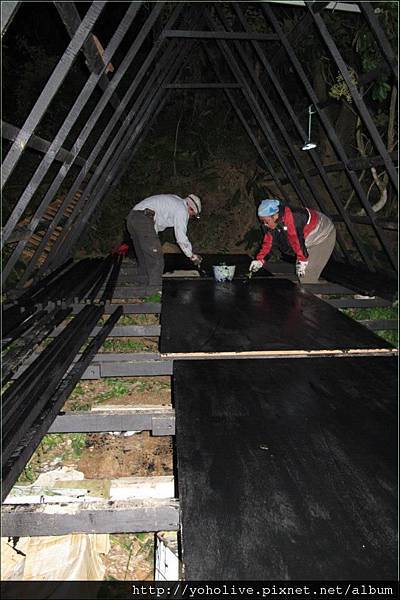 除了桃園在地的活動,當然也少不了三芝基地的持續進展,十一月初首先把所有的木料和木版塗上黑漆,加強木頭的防朽功能,當天我們ㄧ直工作到晚上十一點,連妞妞也很努力的幫忙,