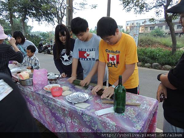 這可愛小巧的麵包窯果真在月底的大瓦屋音樂市集上場囉!大瓦屋是桃園平鎮當地的老字號中藥行"黃復興中藥行"的古厝,還保留著古老的三合院建築,主人ㄧ家大方的提供場地給社區,希望藉活動促進社區的活絡,也凝聚大家的情感。市集當天除了音樂會,也邀請許多在地團體來擺攤,我們藉著月初營隊做的麵包窯(就在這社區裡),在市集裡賣起了手工窯烤披薩,真的是"完全純手工、可親自配料、現場烘烤的窯烤披薩喔!"光聽名字就很吸引人吧,而且每份只要五十元喔,沒錯!當天我們的攤位前可是人山人海,應接不暇。
